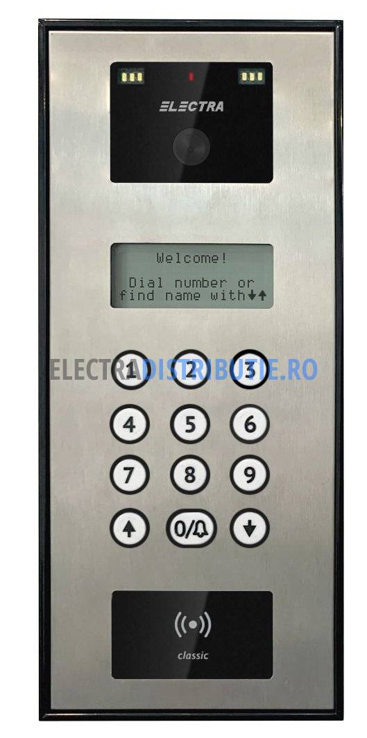PANOU AUDIO-VIDEO Classic Semiduplex digital - BLOCURI - max. 60 apartamente cu terminale video / 255 cu terminale audio Carcasă din Aluminiu și suprafață din INOX, cameră video CMOS, 1/3”, 800 TVL, display electronic pentru listă locatari și afișare status utilizare, tastatură clasică iluminată, acces cu card RFID, gamă temperaturi funcționare -30...+60OC, montaj surface, 260 x 113 x 35 mm Culoare: GRI metalic (INOX) |